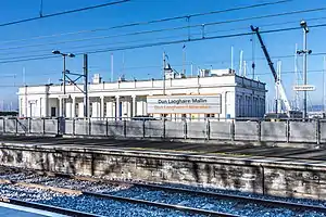 Grierson notes that the station build was completed in 1853 to a design by John Skipton Mulvany by Mr. Roberts doing the "masonry, carpentry, ironmongery, &c," for £1,665. This included the station walls,[lower-alpha 5] while ironwork, roof, and plumbing cost £1,031 by I. & R. Mallet.[8] The roof has since been removed.[9] The station house above the platforms was completed in 1854.[10] a structure in a neo-classical style, designed also by Mulvany.[5] This was the station building until 1971 when the current arrangement was introduced. Mulvany's building became reused as a restaurant.[lower-alpha 6]