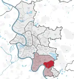 Map of Düsseldorf, showing Benrath (in red) within Borough 9 (in pink)