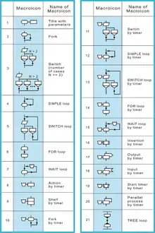 The basis of the graphical syntax is a graphical alphabet. Graphical elements ("letters") of the DRAKON alphabet are called icons (not symbols). DRAKON also has macroicons. Macroicons are the graphical words of the DRAKON language; they consist of icons. There are 27 icons and 21 macroicons in the DRAKON language.
