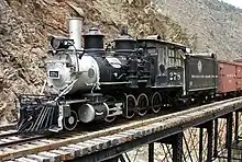 Crossing the Cimarron River just upstream from its confluence with Crystal Reservoir, the bridge holds a static display composed of several pieces of railroad equipment. Representing the types of rolling stock used by the Denver and Rio Grande Railroad on the Black Canyon Route, the display includes a 2-8-0 steam locomotive, D&RGW No. 278, built by Baldwin Locomotive Works in 1882, a coal tender paired with the engine in 1935, a boxcar, D&RGW No.3132, built in 1904 by American Car and Foundry and a caboose, No. 0577, manufactured in 1886.[4] Gifted by the railroad to the nearby town of Montrose in 1952, the engine, along with its tender and caboose, was leased to the National Park Service in 1973.[5]