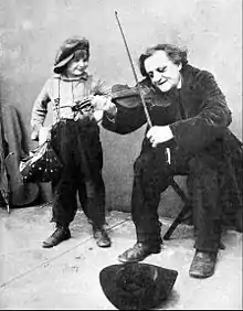 By the time he arrived in the city, he had earned some money by playing in the towns he stopped at on his way. When Jackie heard wonderful violin music on a New York City street corner, he discovered an older gentleman named Cesare playing there for pennies. Cesare welcomed him as a fellow music lover and sensed immediately that Jackie was all alone in the big city. He took the boy home with him. Jackie told Cesare about his mother and the Holdens and Cesare told him about the great violinists he had known. Cesare put Jackie to work on fingering exercises and scales; the two musicians played on the street together during the day and went home together each evening.[5][6]