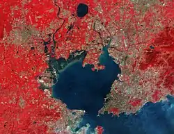 The Dagu River which flows into the Jiaozhou Bay is clearly visible in this satellite image of Qingdao