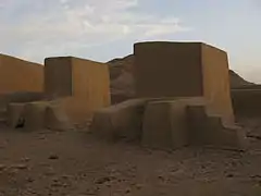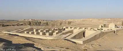 Dahan-e Gholaman is the largest Achaemenid site in all of eastern Iran.[2] Some 27 structures aligned roughly in a straight line running SW to NE along the northern edge of the site were excavated by the Italian archeologist U. Scerrato in 1962–1965 and by the Iranian archeologist S. M. S. Sajjadi in 2000–2005. Further geophysical and surface exploration in 2007–2011 revealed the outline of another monumental building situated 2 km south of the northern complex of buildings.[3] Several of the larger structures excavated or detected at Dahan-e Gholaman have regular rectangular or square plans and bear comparison with the palatial buildings and audience halls of the Achaemenid royal residences at Pasargadae and Persepolis, as well as Dasht-e Gohar.[4] One of the structures has been identified as a religious building, its three altars possibly dedicated to the leading Persian gods Ahura Mazda, Anahita, and Mithra.[5]