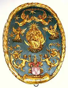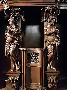 The only work that has been signed by van Vlierden are seven confessionals that he made for the Dominican church in Maastricht and are now in the Basilica of Saint Servatius. One of the seven confessionals has a sculpture of King David holding a harp. On the body of the harp is written: d. van vlierden fecit hasselen. This ensemble can be dated between 1695 and 1706 on the basis of the dates that are painted on the confessionals. The iconography of the confessionals constitutes a coherent whole.[1] This was in line with the requirements of the Counter-Reformation which demanded that artists created paintings and sculptures in church contexts that would speak to the illiterate rather than to the well-informed. The Counter-Reformation stressed certain points of religious doctrine, as a result of which certain church furniture, such as the confessional gained an increased importance.[4] The Dominicans for whom van Vlierden made the confessionals in Maastricht also subscribed to the view that the confessionals should clarify the deeper meaning of the confession to the faithful. A similar programmatic scheme of confessionals and interior decoration had been implemented previously in the St. Paul's Church in Antwerp. The seven Maastricht confessionals follow this example.