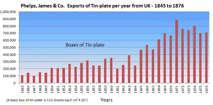 Phelps, James & Co. dominated the export of tinplate from the UK. In America the imported tinplate was used for manufacturing such things as roofing, tools, machinery, cans, cutlery, skillets, pots, pans, pitchers, plates, washing boards, bathtubs, etc.[18]