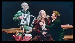 Daniel Johansson as Nemorino (right) and Åke Zetterström as Dulcamara (center) in L'elisir d'amore at the Göteborgsoperan 2013.