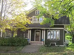 The house was built in 1915 for local grocer Daniel Byrns and his wife Nellie.[2] Both Daniel and Nellie were Irish immigrants; they originally lived on a farm in the Town of Lodi, but Byrns opened a grocery store in the city by 1913.[3] The one-and-a-half-story house has a bungalow design, a popular choice in the 1910s; its architect and builder are unknown. The house features a screened wraparound porch, square pilasters flanking the front entrance, and a large gabled dormer with a small balcony above the entrance. It is the largest and best-preserved example of a bungalow in Lodi.[4]