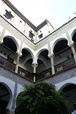 It was built by the future Dey Mustapha Pacha between 1798[3] and 1799.[4] The main entrance to the palace is situated at No. 12 Ahmad and Muhammad Mecheri Street, under a projecting roof terrace which is bordered by rows of Roman tiles.[5] The main door opens onto a sqifa (entrance hall), which leads to the main courtyard of the palace. The courtyard is sheltered with groined vaults and is dispersed with decorative niches which form window-seat benches. There is also a second entrance hall which is overlooked by two marble-framed doors; this connects the main sqifa used by visitors to enter the interior courtyard. The centre of the residential quarters is surrounded by galleries and supported by arches which rest on marble columns and are distinguished by decorative tiles. The ceilings are supported by wooden beams which cover the galleries on the ground floor and the first floor of the palace.[5]