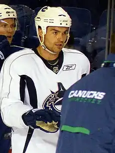 Hordichuk was fined $2,500 by the NHL early in the 2009–10 season after checking Columbus Blue Jackets winger Jared Boll's head into the boards during a game on October 5, 2009.[8] The following month, Hordichuk received an automatic one-game suspension for instigating a fight with St. Louis Blues forward Cam Janssen in the final five minutes of a game on November 10. Incidentally, he forfeited $4,015.54 in salary.[9] On October 2, 2010, the Vancouver Canucks placed Hordichuk on waivers.[10] Instead of sending him down to the minors, Vancouver traded him to the Florida Panthers for Andrew Peters. Canucks' GM Mike Gillis had previously pledged to try to find Hordichuk another NHL job.[11]