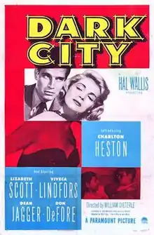 Dark City is a 1950 American film noir crime film starring Charlton Heston in his Hollywood debut, and featuring Lizabeth Scott, Viveca Lindfors, Dean Jagger, Don DeFore, Ed Begley, Jack Webb and Harry Morgan. It was produced by Hal B. Wallis and directed by William Dieterle.
