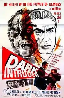 Dark Intruder is a 1965 horror TV movie that was released theatrically, and starring Leslie Nielsen, Mark Richman and Judi Meredith. The film is set in San Francisco in 1890 concerning playboy sleuth and occult expert Brett Kingsford. This atmospheric black-and-white film, only 59 minutes long, was directed by Harvey Hart and was the pilot for a failed television series called The Black Cloak. It was written by Barré Lyndon.