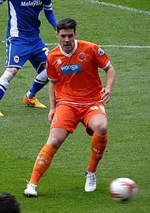 O'Dea then signed with championship club Blackpool in December 2014,[55] making his debut in a 6–1 loss to Bournemouth. Bournemouth's fourth goal was scored by Brett Pitman, converting a penalty shot incurred by O'Dea (who fouled Callum Wilson in the penalty area).[56] Against Wolverhampton Wanderers, the BBC reported that he "got into a terrible muddle trying to cut out a pass from Kevin McDonald" and allowed Benik Afobe (in his first game for Wolverhampton) to score the second goal.[57] O'Dea was injured in a match against Nottingham Forest in February 2015, forcing him to miss the game with Blackburn Rovers.[58] Released when his contract expired in May, he said the club had a "disastrous season".[59] O'Dea played 20 times for Blackpool.[43]