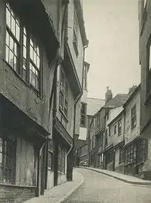 The town contains many medieval and Elizabethan streetscapes and is a patchwork of narrow lanes and stone stairways. A significant number of the historic buildings are listed.[17] One of the most obvious is the Butterwalk, built 1635 to 1640. Its intricately carved wooden fascia is supported on granite columns. Charles II held court in the Butterwalk whilst sheltering from storms in 1671 in a room which now forms part of Dartmouth Museum.[18] Much of the interior survives from that time.