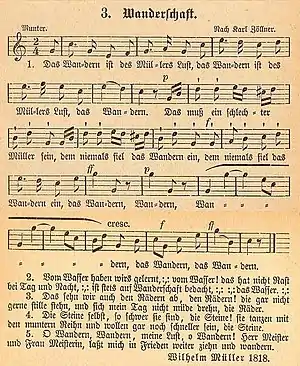 "Das Wandern ist des Müllers Lust" ("To wander is the miller's delight")[1] is the first line of a poem by Wilhelm Müller, written in 1821 with the title "Wanderschaft" as part of a collection, Die schöne Müllerin. While wandern is defined as "hiking" today, it referred to the required journeyman years of craftsmen when written, in this case of a miller.