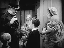 Mr. Micawber (played by W. C. Fields) addresses young David Copperfield (Freddie Bartholomew).