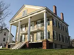 The mansion could be described as a conjunction of the Greek Revival and late Federal-styles.[3] It was built by David Crawford, who had made his fortune in Hudson River shipping in during the 1820s.[4] Crawford was leased the land on March 8, 1830, by the Trustees of the Glebe, for a period of 900 years.[5] His family originated from Ulster, and immigrated to America in 1731, settling Little Britain alongside the Clinton family. The Crawfords moved to Newburgh in 1806 as David's father, Francis, saw a burgeoning market for agricultural products.[6] With Eunice Watkins of Campbell Hall, he had four sons: David, Thomas, Samuel and James.[5] The brothers and their mother succumbed to tuberculosis, and David ameliorated his health by accepting a job as a deputy sheriff in 1810.[6] Frequent horseback-riding built up his immunity.