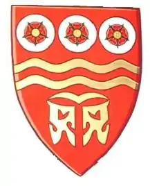 Gules two bars wavy Or between in chief three plates each charged with a rose Gules barbed and seeded Proper and in base a Māori Tā Moko symbol Or