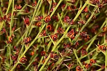 Daviesia hakeoides is a glabrous shrub that typically grows to 0.3–1 m (1 ft 0 in – 3 ft 3 in) high and 0.5–2 m (1 ft 8 in – 6 ft 7 in) wide and has many tangled stems. The phyllodes are scattered, sharply-pointed and needle-shaped, up to 80 mm (3.1 in) long and 1.5 mm (0.059 in) wide at the base. The flowers are borne in groups of two to six in leaf axils on a peduncle 1.0–1.5 mm (0.039–0.059 in) long, the rachis less than 2 mm (0.079 in) long, each flower on a pedicel 1–6 mm (0.039–0.236 in) long with overlapping bracts about 1–2 mm (0.039–0.079 in) long at the base. The sepals are 2.0–2.5 mm (0.079–0.098 in) long and joined at the base, the upper two lobes more or less joined for most of their length and the lower three pointed and spread apart. The standard petal is broadly elliptic, 4.5–6 mm (0.18–0.24 in) long and yellow or orange with a dark red centre, the wings 5.0–5.5 mm (0.20–0.22 in) long and dark red, and the keel about 5 mm (0.20 in) long and dark red. Flowering mainly occurs from May to July and the fruit is an slightly inflated triangular pod 14–17 mm (0.55–0.67 in) long.[2][3]