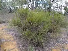 Daviesia localis is an erect, spreading shrub, typically 1.5–3 m (4 ft 11 in – 9 ft 10 in) high and about 3 m (9.8 ft) wide with divergent, spine-tipped branchlets. Its phyllodes are scattered, needle-shaped, gently curved, sharply-pointed, 2–8 mm (0.079–0.315 in) long and 0.7–1.2 mm (0.028–0.047 in) wide. The flowers are arranged in groups of four to seven in leaf axils on a peduncle 5–9 mm (0.20–0.35 in) long with oblong to narrow elliptic bracts 0.7–1.1 mm (0.028–0.043 in) long at the base, each flower on a pedicel 1.5–7 mm (0.059–0.276 in) long. The sepals are 3.8–5.2 mm (0.15–0.20 in) long and joined at the base, the upper two lobes joined for most of their length and the lower broad and less than 0.3 mm (0.012 in) long. The standard petal is egg-shaped with a deep notch at the tip, 8.5–9.5 mm (0.33–0.37 in) long and orange-yellow with a red flare and yellow, v-shaped central mark. The wings are 6.0–6.7 mm (0.24–0.26 in) long and dull red, and the keel 5.5–6.0 mm (0.22–0.24 in) long and dull red. Flowering occurs in October and November and the fruit is a triangular pod 15–18 mm (0.59–0.71 in) long.[2][3][4]