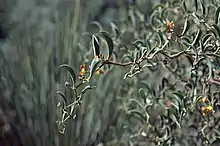 Daviesia tortuosa is a spreading, glabrous and glaucous shrub that typically grows up to 1 m (3 ft 3 in) high, 2 m (6 ft 7 in) wide and has many tangled, wiry, zigzagging branchlets. Its phyllodes are scattered, narrowly elliptic to narrowly egg-shaped with the narrower end towards the base, 10–35 mm (0.39–1.38 in) long, about 4–12 mm (0.16–0.47 in) wide and sharply pointed. The flowers are usually arranged in clusters of two to five in leaf axils on a peduncle 3–4 mm (0.12–0.16 in) long, the rachis 2.5–9 mm (0.098–0.354 in) long, each flower on a pedicel 1–2.5 mm (0.039–0.098 in) long. The sepals are 4.5–5.0 mm (0.18–0.20 in) long and joined at the base, the upper two lobes joined for most of their length and the lower three triangular and about 0.75 mm (0.030 in) long. The standard petal is broadly elliptic, 6.5–7.0 mm (0.26–0.28 in) long and wide, and yellow with orange markings. The wings are 6–7 mm (0.24–0.28 in) long and rich yellow, the keel about 5 mm (0.20 in) long and rich yellow. Flowering occurs from January to April and the fruit is a triangular pod 18–20 mm (0.71–0.79 in) long.[2][3]