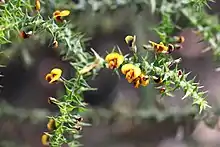 Daviesia villifera is an open shrub with arching branches, that typically grows to a height of 1.5–2 m (4 ft 11 in – 6 ft 7 in) and has most parts covered with bristly hairs. The phyllodes are crowded, broadly to narrowly egg-shaped to heart-shaped, 5–10 mm (0.20–0.39 in) long and 2–6 mm (0.079–0.236 in) wide and sharply-pointed. The flowers are arranged singly or in pairs in leaf axils on a peduncle 0.5–1.1 mm (0.020–0.043 in) long, the individual flowers on a pedicel 1.5–8.5 mm (0.059–0.335 in) long. The sepals are 2.4–2.9 mm (0.094–0.114 in) long and joined at the base, the upper two joined for most of their length and the lower three broadly triangular. The standard petal is egg-shaped, about 5 mm (0.20 in) long and 5.75 mm (0.226 in) wide and yellow with a red base and rich yellow centre, the wings yellow with a red base and about 5 mm (0.20 in) long, and the keel dull red and 4.75 mm (0.187 in) long. Flowering occurs from June to October and the fruit is a flattened triangular pod 9–11 mm (0.35–0.43 in) long.[2][3]