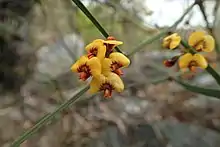 Daviesia wyattiana, commonly known as long-leaf bitter-pea,[2] is a species of flowering plant in the family Fabaceae and is endemic to eastern Australia. It is a sparse, erect shrub with long, linear phyllodes, and groups of four to seven yellow flowers with red or purplish markings.