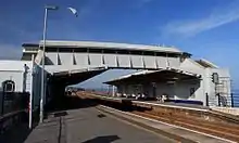 The platforms have been extended several times to cope with the crowds and now nearly reach Coastguards' Footbridge, although the Exeter platform was shortened again in 1970.[8] The decorative iron and glass canopies above the platforms were replaced by concrete beams and glass panels in 1961 but the glass has since been replaced by Perspex.[9] Goods traffic was withdrawn on 17 May 1965.