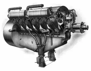 The propeller shaft was geared down from the crankshaft by spur gears and rotated at half the engine speed. The intake and exhaust valves were controlled by a single camshaft, which was placed between the two rows of cylinders. The camshaft was connected to the propeller shaft and therefore also rotated at half speed of the crankshaft.