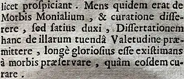 Diatriba (1713). «Mens quidem erat de Morbis Monialium, & curatione differere; sed satius duxi, Dissertationem hanc de illarum tuenda Valetudine præmittere, longe gloriosius esse existimans a morbis præservare, quam eosdem curare» (the intention was undoubtedly to take into account the illnesses and the care of the nuns, but I thought it would be preferable to include an essay on the protection of their health, believing that it is more convenient to prevent diseases than to treat them).