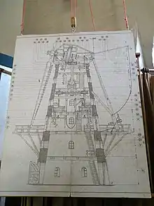 De Prins van Oranje is what the Dutch call a "Walmolen". It is a five-storey tower mill with a stage, which is 8.60 metres (28 ft 3 in) above ground level.[6] The cap is covered in dakleer. Winding is by tailpole and winch. The sails are Common sails. They have a span of 27.00 metres (88 ft 7 in). They are carried on a cast iron windshaft, which was cast by Nolet c.1840. The windshaft also carries the brake wheel, which has 58 cogs. This drives a wallower with 27 teeth, which is situated at the top of the upright shaft. At the bottom of the upright shaft is the great spur wheel, which has 87 cogs. This drives two pairs of 1.40 metres (4 ft 7 in) Cullen millstones via lantern pinion stone nuts with 26 staves each. The stones are overdrift millstones.[1]