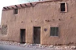 The De Vargas Street House is a two-story adobe building; the first floor is original and the second floor was reconstructed based on the original in the 1920s. Most of the house is constructed from adobe brick, which was a Spanish colonial technology, while a few lower wall sections are puddled adobe characteristic of pre-Spanish pueblo buildings. The first-floor ceiling is original and includes vigas dating to the mid-18th century. The first floor interior has two Spanish colonial-style rooms with corner fireplaces, while the second floor is "a dummy" and not open to visitors.[1][13]
