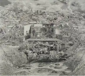 Writers suggest that Byington's later paintings explore historical and sociopolitical themes in a more expansive, cinematic manner in terms of vastness (their large scale and God's-eye views), sweeping subjects (climate change, terrorism, urban sprawl) and time (a sense of layer centuries of history including the potential future).[6][2][38] These paintings blur notions of urban and rural, ancient and modern, piling intractable ambiguities and compressed, distressed and fragmentary realities into monumental landscapes, geologic formations and industrial sites suggestive of post-human or post-apocalyptic, possibly alternate civilizations (Omphalos, 2011).[18][29][9][39] SquareCylinder described the maze of cellblock-like huts, scaffolding and brickwork in the black-and-white landscape Divided City (2015) as "an unending public works project … depict[ing] a mismanaged future, an allegory of Big Plans and half-starved dreams."[40]