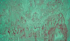 As the decade progressed, Byington pushed the horror vacui sense of density in the work and also began creating color canvasses that suggested mysterious minimalist monochromes in which his signature imagery appeared as if seen through an aquarium or fog (e.g. Underground #1, 2006; Waterfalls 2010);[5][32][27] The New Yorker described them as "glazed in candy-colored pink, green, or robin’s-egg blue, like Easter eggs—or blotter acid."[37] This work included the green "Underground" series, which featured with geologic forms: stalactites, stalagmites, minerals, gems, and cave-like openings into various spaces.[21]