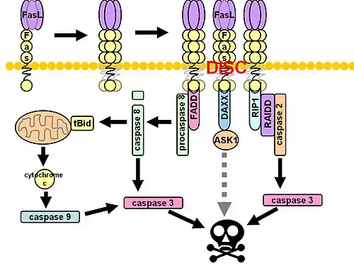 The death-inducing signaling complex or DISC is a multi-protein complex formed by members of the death receptor family of apoptosis-inducing cellular receptors.[1] A typical example is FasR, which forms the DISC upon trimerization as a result of its ligand (FasL) binding. The DISC is composed of the death receptor, FADD, and caspase 8. It transduces a downstream signal cascade resulting in apoptosis.
