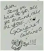 Callahan was killed in a vehicle crash, along with the driver, Michael Hager, after the Vanagon in which they were riding crashed into a pair of trees on U.S. Route 58 West around 1:30 PM on June 26, 1995.[7][8][9][10] Neither man was wearing a seat belt, which likely contributed to each of their deaths.[11][12] Found with Callahan's body were two scalped Grateful Dead tickets, a dollar in quarters, and a yellow Bic lighter. A letter was found, depending on sources either in Callahan's pocket or near the crash site, reading: "Jason, Sorry we had to go, see ya around, call me #914-XXXX. Caroline T. & Caroline O. Bye!!!!". The phone number on the letter lacked an area code and never led to any additional clues. The letter also contained a small drawing that some speculate may be of Jerry Garcia.[8][13] The tickets were dated June 24, 1995, and June 25, 1995, respectively; the Grateful Dead performed at the Robert F. Kennedy Memorial Stadium in Washington, D.C., on these dates.[11] Authorities were able to trace the tickets to a Pennsylvania man, but the man turned out to be a ticket reseller and could not recall the details of who he sold them to.[14] Neither of the 'Carolines' have ever been identified.[15]
