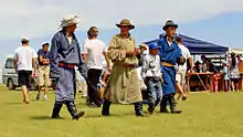 Men in traditional Mongolian costumes (deel) before starting of a local Naadam festival in Kharkhorin