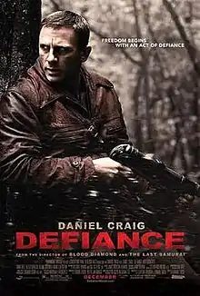 Defiance is a 2008 American war film directed by Edward Zwick set during the occupation of Belarus by Nazi Germany. The screenplay by Clayton Frohman and Zwick was based on Nechama Tec's 1993 book Defiance: The Bielski Partisans, an account of the eponymous group led by Polish Jewish brothers who saved and recruited Jews in Belarus during the Second World War. The film stars Daniel Craig as Tuvia Bielski, Liev Schreiber as Zus Bielski, Jamie Bell as Asael Bielski, and George MacKay as Aron Bielski.