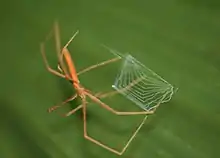 Deinopis spinosa, known generally as the ogrefaced spider or net-casting spider, is a species of ogrefaced spider in the family Deinopidae. It is found in the United States, St. Vincent, and Venezuela.[1][2][3][4] This spider is notable for its use of a net to catch prey. It does this by holding a small web stretched across its legs while it is suspended from a sparse web frame. When prey approaches the spider, it lunges forward and captures the insect in its net. In order to capture prey flying above it the spider uses a backward striking motion. When prey is outside its field of vision this spider appears to use a sensory organ located on its front legs to sense to prey. This sensory organ is known as the metatarsal organ. During the day, the spider is immobile and camouflages itself on its host palm plant. At night, the spider hunts.[5]