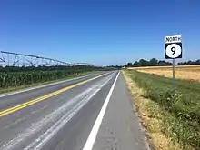 U.S. Routes that run north–south have odd numbers, increasing from east to west, while those that run east–west have even numbers, increasing from north to south. Major north–south U.S. Routes have numbers ending in 1 while major east–west U.S. Routes have numbers ending in 0.[5] Three-digit U.S. Routes serve as branches of their parent route.[7] As such, U.S. Route 13 (US 13) runs north–south through the entire length of Delaware while US 40, a major U.S. Route running from Utah to New Jersey, passes east–west through northern New Castle County. US 113 serves as a branch of US 13 in the southern part of the state. US 9 is an exception to the numbering pattern as it runs east–west across Sussex County, though the route runs north–south in New Jersey and New York.[6]