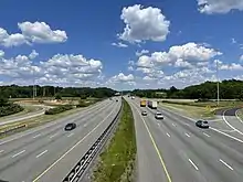 The roads maintained by DelDOT include Interstate Highways, other freeways, arterial roads, collector roads, and local roads serving both urban and rural areas.[6][23] Delaware has a total of 40.61 miles (65.36 km) of freeway considered part of the Interstate Highway System.[1] Non-Interstate freeways in the state include the portion of DE 1 between Dover Air Force Base and Christiana, the section of DE 141 between south of Newport and Prices Corner, and the Puncheon Run Connector that links US 13 and DE 1 in Dover. Three toll roads exist in the state.[6] A mainline toll plaza is located along the Delaware Turnpike portion of I-95 near the Maryland border in Newark.[6][27] Tolls are also collected along the DE 1 freeway, with mainline toll plazas at Dover and Biddles Corner and ramp tolls at North Dover, South Smyrna, and Boyds Corner.[6][28] Tolls along I-95 and DE 1 may be paid with cash or an electronic toll collection system known as E-ZPass.[27][28] The US 301 toll road runs from the Maryland border near Middletown northeast to DE 1 in St. Georges. US 301 uses all-electronic tolling, where tolls are paid with E-ZPass or toll-by-plate, which uses automatic license plate recognition to take a photo of the vehicle's license plate and mail a bill to the vehicle owner. The road has a mainline toll gantry north of the Maryland border and ramp toll gantries on the southbound exits and northbound entrances at the DE 299, DE 71, and Jamison Corner Road interchanges.[29] The DRBA also collects tolls for the Delaware Memorial Bridge for motorists entering Delaware from New Jersey using cash or E-ZPass.[30] Highways and other transportation projects in Delaware are funded through both the Transportation Trust Fund and the Federal Highway Trust Fund. The Transportation Trust Fund receives revenue from tolls along I-95 and DE 1, motor fuel taxes of 23 cents per gallon on gasoline and 22 cents per gallon on special fuels, motor vehicle document and registration fees, and DMV fees. In 2013, revenues from the Transportation Trust Fund were $445.4 million while revenue from the Federal Highway Trust Fund totaled $214.5 million.[23]