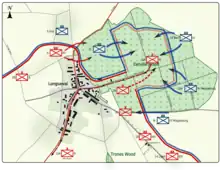 The Germans spotted the forming up of the troops in the wood and fired an unprecedented bombardment; every part of the area was searched and smothered by shells.[37] During the barrage, German troops attacked and infiltrated the South African left flank, from the north-west corner of the wood. By 2:00 p.m., the South African position had become desperate as German attacks were received from the north, north-west and east, after the failure of a second attempt to clear the north-western corner. At 6:15 p.m., news was received that the South Africans were to be relieved by the 26th Brigade. The 3rd Division attack on Longueval had taken part of the north end of the village and Armin ordered an attack by the fresh 8th Division, against the Buchanan Street line from the south east, forcing Thackeray to cling to the south western corner of the wood for two days and nights, the last link to the remainder of the 9th Division (Map 4).[37]