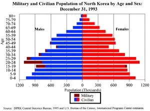 The figures disclosed by the government reveal an unusually low proportion of males to females: in 1980 and 1987, the male-to-female ratios were 86.2 to 100, and 84.2 to 100, respectively.[13] Low male-to-female ratios are usually the result of a war, but these figures were lower than the sex ratio of 88.3 males per 100 females recorded for 1953, the last year of the Korean War.[13] The male-to-female ratio would be expected to rise to a normal level with the passage of years, as happened between 1953 and 1970, when the figure was 95.1 males per 100 females.[13] After 1970, however, the ratio declined. Eberstadt and Banister suggest that before 1970 male and female population figures included the whole population, yielding ratios in the ninetieth percentile, but that after that time the male military population was excluded from population figures.[13]