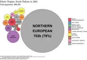 In the 2000 census, the five largest ancestry groups in South Dakota were: German (40.7%), Norwegian (15.3%), Irish (10.4%), Native American (8.3%), and English (7.1%).[21] German-Americans are the largest ancestry group in most parts of the state, especially in the east, although there are also large Scandinavian populations in some counties.