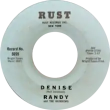 The American doo-wop group Randy & the Rainbows recorded "Denise" with the producers of The Tokens, releasing it as a single in 1963.[3] The group's name "Randy & the Rainbows" was chosen by the owners of Laurie Records after the group recorded "Denise". Previously, the band had been called "Junior & the Counts" and "The Encores".[3] "Denise" spent seventeen weeks on the Billboard Hot 100 chart, settling at number 10,[4][5] while peaking at number 18 on the Billboard Hot R&B Singles chart,[6] and number 5 on Canada's CHUM Hit Parade.[7]