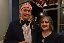 L'Estrange-Corbet with Francis Hooper at an investiture dinner in 2014, following Hooper's appointment as a MNZM