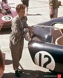 In San Francisco in the early 1950s, while covering a yacht race, she met Briggs Cunningham, who built the first American cars to race at Le Mans. She bought her first sports car, an MG TC Midget, and began racing at small club events. In 1954 she moved to New York to work at the New York Herald Tribune as a sports journalist. The MG was replaced with a Jaguar XK140; she began to race professionally, and earned the respect of her male counterparts. Her trademark was a white helmet with pink dots. Her racing achievements included winning the grand touring category at Sebring in a Ferrari 250 GT in 1961, and a class win in the Monte Carlo Rally in a Ford Falcon in 1964. She also participated in the Nürburgring 1000 km sports car race. She drove Porsches, Maseratis, and other racing cars of many marques, often with another woman driver, Pinkie Rollo. She ended her racing career in the late 1960s.[1]