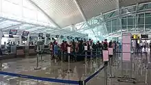 Open to the public on 17 September 2014, the new Domestic Terminal area is 65,800 m2 (708,000 sq ft) or four times larger than the old one. It can serve up to 9.4 million passengers a year, has 62 check in counters, four transit and transfer counters, 19 ticket counters, eight boarding gates and seven arrival gates which are provided by five aviobridges (garbarata) and 5 unit conveyor belts.[22]