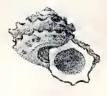 The size of the shell varies between 12 mm and 20 mm. The shell is rather narrowly umbilicated. It has a pale orange yellow color, radiated and spotted with a reddish chestnut. The three whorls contain scaly-prickly keels at the periphery and are slopingly flattened above. The suture is excavated. The surface above and below contain minutely beaded revolving striae.[2]