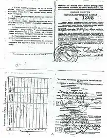Details of resettlement were defined in the Soviet Union's Council of Ministers’ Resolution No. 754. The part of kolkhoz's (collective farm) moveable property was assigned and gratuitous transportation of this property to the new settlement was provided for the deported. The price of moveable property abandoned in Armenia was paid for in kolkhozes at places of the new settlement of Azerbaijanis. Some benefits were given to migrants and at the same time, permanent grants of 1000 rubles were given out per head of the family and 300 rubles per each member of the family. According to historian Vladislav Zubok, due to calls from Grigory Arutinov, the First Secretary of Armenian SSR's Communist Party's Central Committee, Stalin ordered to deport Azerbaijani population from the Armenian SSR to the Azerbaijan SSR. At the same time, he gave consent for the repatriation of 90,000 Armenians to settlements of the newly deported Azerbaijanis.[17][18][19] The resettlement was not voluntary.[20]