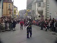 The character Hänsele appears on the Saturday and Sunday before Ash Wednesday.[2] It also appears in July in connection with the Überlinger Schwerttanzkompanie (Sword dance company of Überlingen) at the second Schwedenprozession (a procession to commemorate the successful defense of the Swedish siege in the Thirty years War) on the second Sunday in July. During the sword dance only one person at a time plays Hänsele, and he is involved in all civic celebrations; his identity usually remains anonymous. Hänsele's costume is noted for its colorful felted squares, its fox tail, and the women's perfume worn on the mask. In addition, Hänsele carries a heavy whip; prior to Fasnet, groups of uncostumed Hänseles gather in the market square to practice snapping their whips.